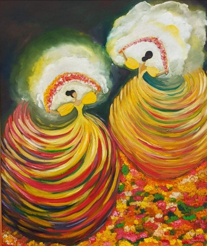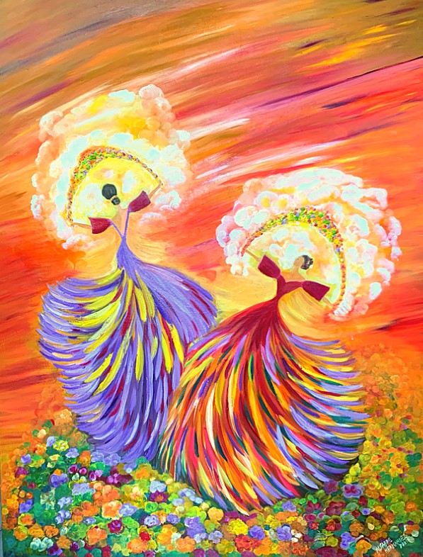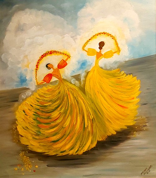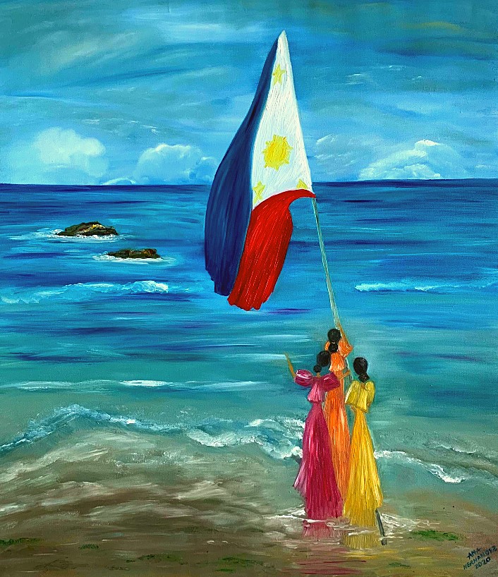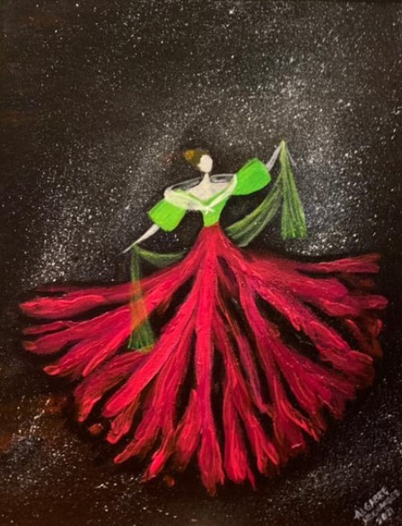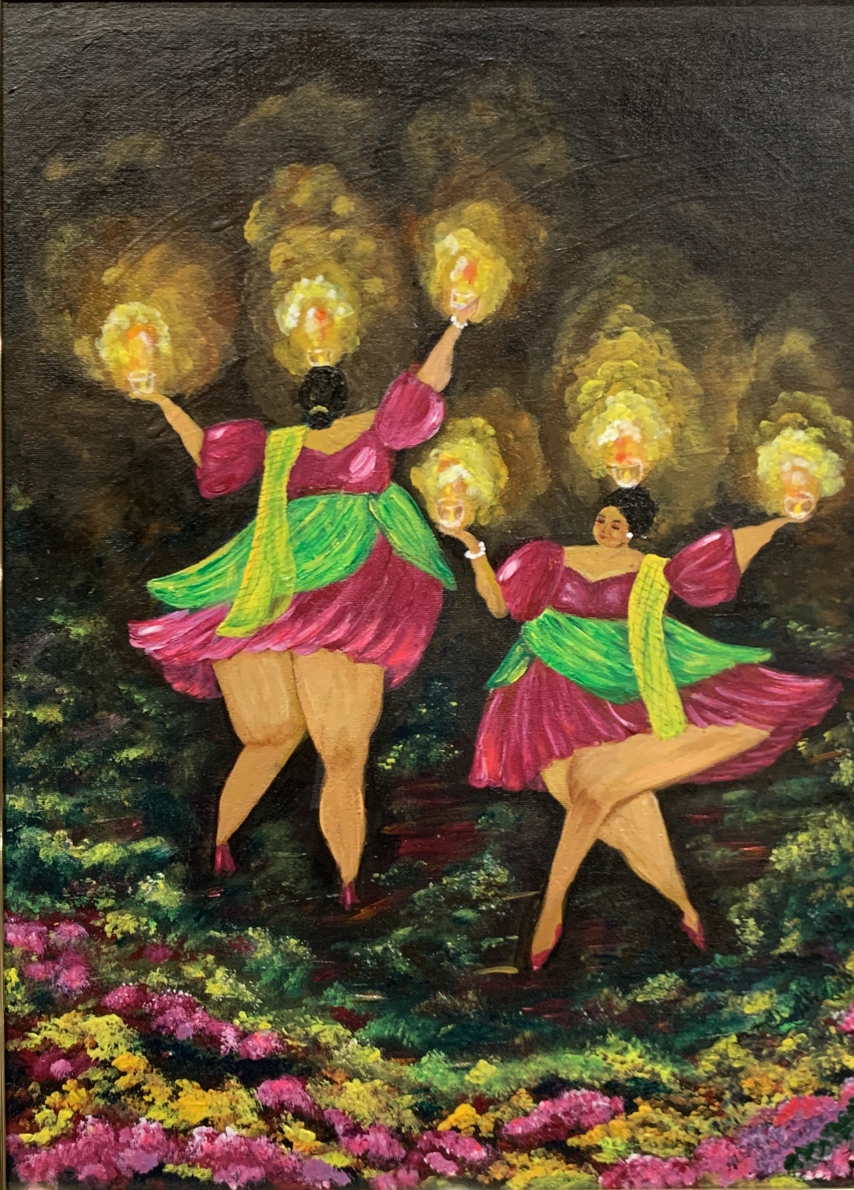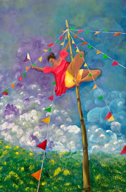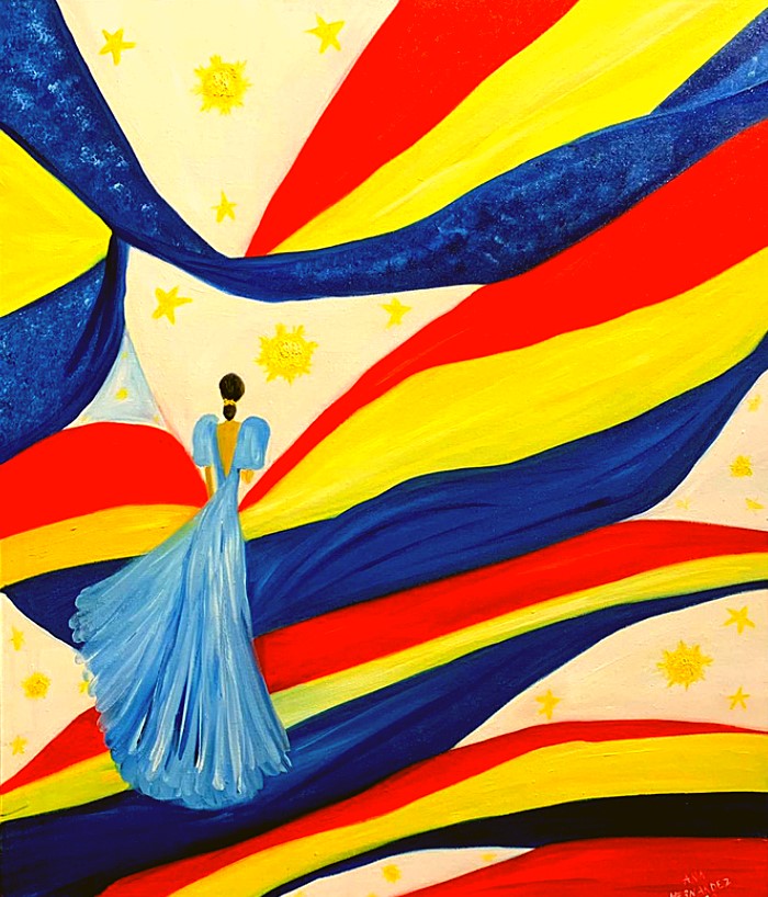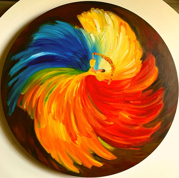The Philippine folk dance of floral garlands that started in the Tagalog region in northern Philippines is seen in my work. While this dance is dedicated to the Virgin Mary and performed during the early month of May as part of the Catholic celebration of the Holy Week, the strokes and color in this artwork are reminiscent of the Sarimanok, the legendary bird of the Maranao people from Mindanao. The Sarimanok is a popular symbol of Muslim art in Southern Philippines. “Sari” means cloth, usually in assorted colours and “manok” means chicken.