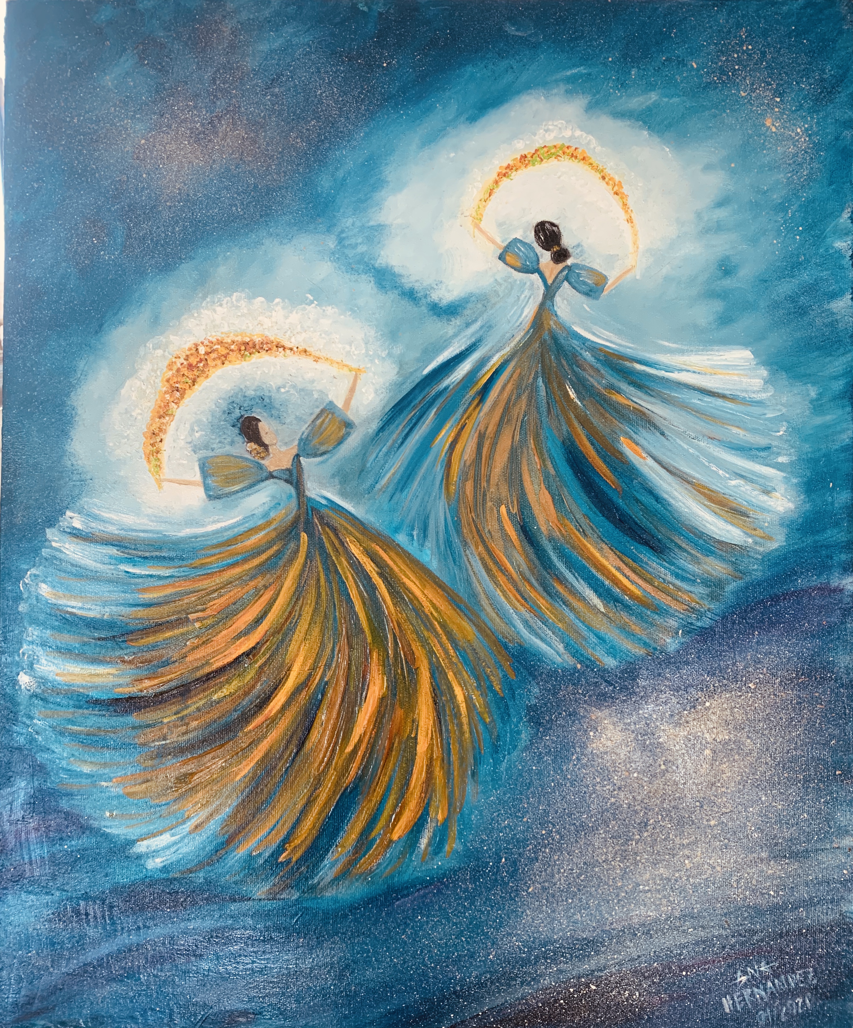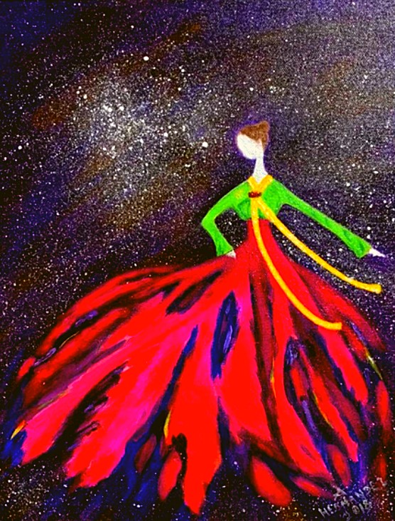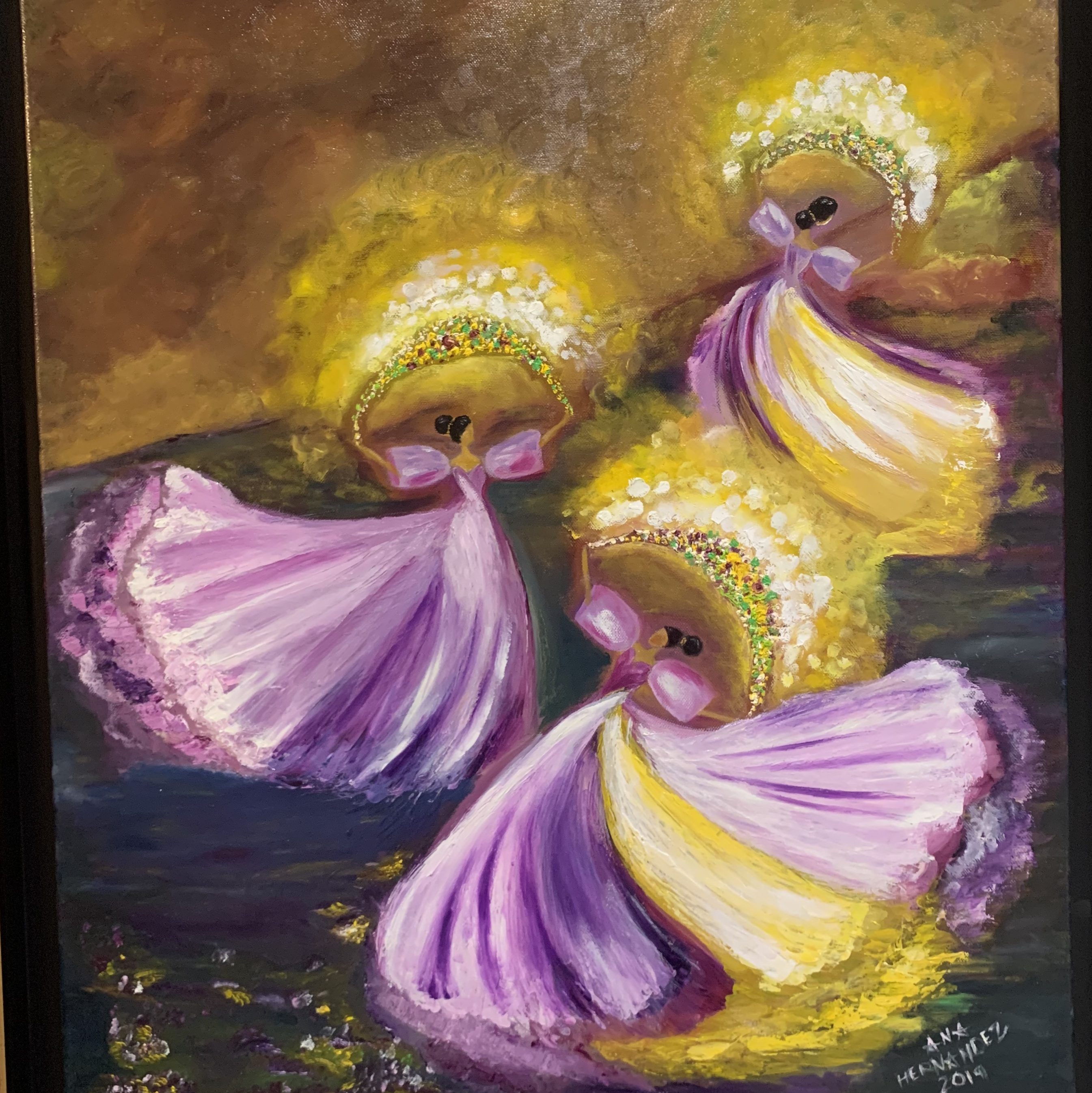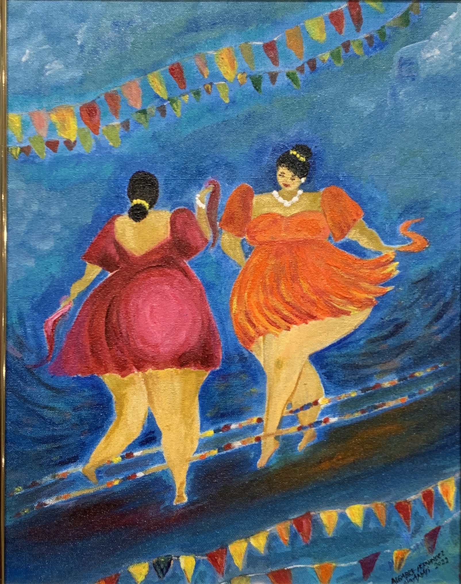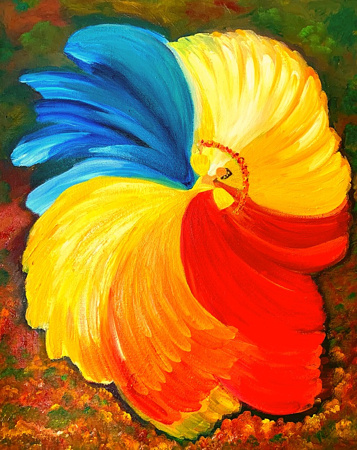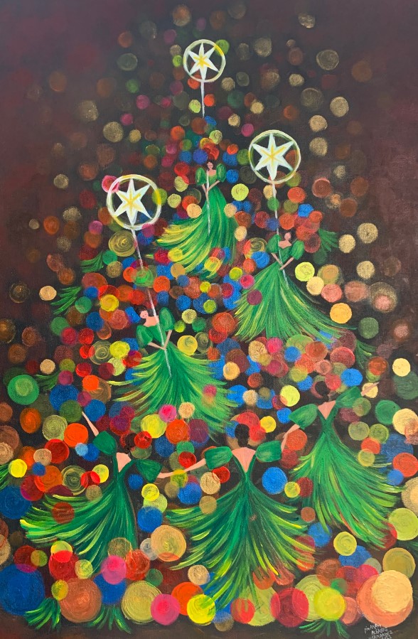 The Philippine folk dance of floral garlands that started in the Tagalog region in northern Philippines is seen in my work. While this dance is dedicated to the Virgin Mary and performed during the early month of May as part of the Catholic celebration of the Holy Week, the strokes and color in this artwork are reminiscent of the Sarimanok, the legendary bird of the Maranao people from Mindanao. The Sarimanok is a popular symbol of Muslim art in Southern Philippines. “Sari” means cloth, usually in assorted colours and “manok” means chicken.