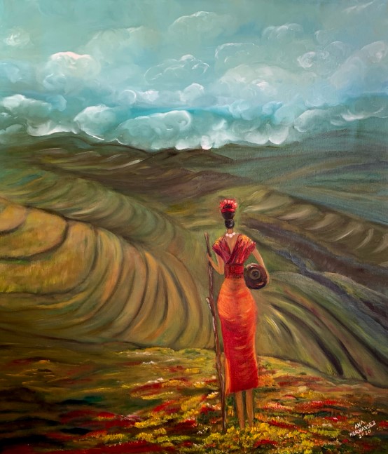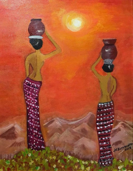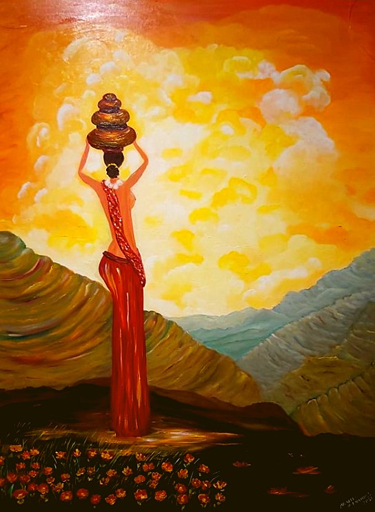 Most are either head carrying loads or are simply at awe with the green landscape under the yellow, orange or blue sky.